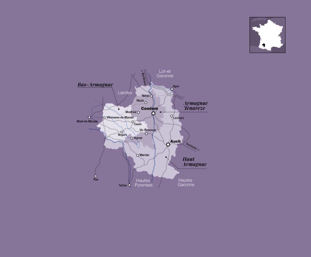 Le aree di produzione si suddividono così: ad ovest il Bas Armagnac, zona sabbiosa e vallonata con piccole foreste; al centro Ténarèze, zona transitoria e dal suolo contrassegnato da erosioni; a sud e ad est l’Haut Armagnac, terreno calcareo/argilloso. Le prime tracce dell’Armagnac risalgono al Medioevo quando era indicata come Aygue Ardente. La produzione regolare inizia verso metà del Seicento e circa mezzo secolo più tardi se ne sviluppa il commercio. L’Armagnac si distilla in alambicchi speciali, detti a ripiani, nei quali i vapori alcolici del vino passano dal basso verso l’alto. Si distillano sempre vini d’annata e comunque sempre in inverno. Per i degustatori più raffinati è questa la zona più vocata per ottenere un distillato di eccellente livello.