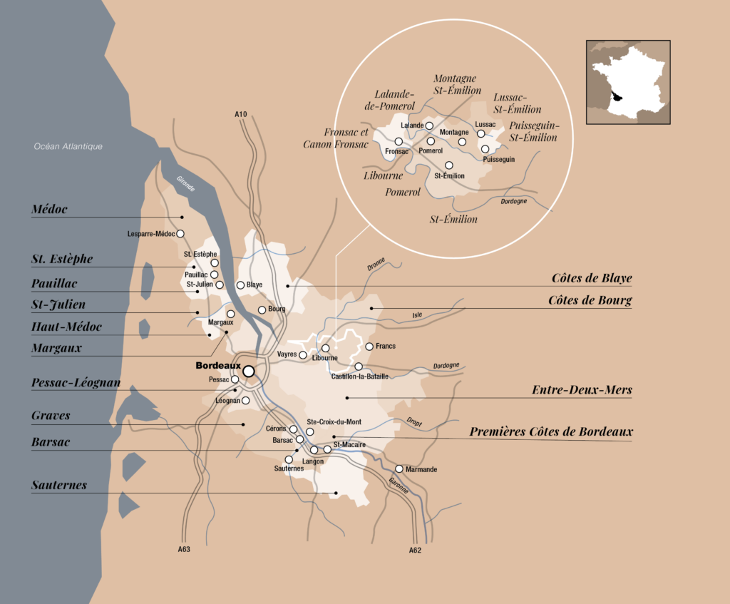 È la zona a sud-ovest della Francia, nel département Gironde, dove i fiumi Dordogne e Garonne confluiscono nell’insenatura Gironde. La vite si coltiva dai tempi del poeta e console Ausonio (IV secolo a.C.). Dal 1152 inizia l’epoca di grandezza con l’esportazione dei vini in Inghilterra, grazie al matrimonio di Eleonora di Aquitania con Enrico II d’Inghilterra.