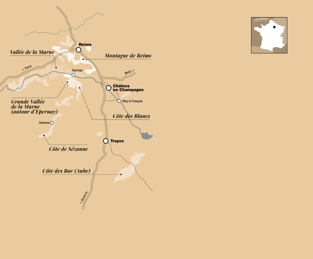 È il vino più conosciuto al mondo e proviene esclusivamente dall’omonima regione Champagne-Ardenne, a circa 150 km a est di Parigi. La vite qui prospera dall’epoca romana in una zona al limite geografico per la sua coltivazione ed il suolo è prevalentemente composto da craie, pietra calcareo-gessosa che ne costituisce ben il 75%. I suoi vini diventarono popolari tra la fine del XIV e il XVI secolo, con i cosiddetti vin gris che arrivavano fino alla corte del Re di Francia e, soprattutto, spopolavano Oltremanica.
