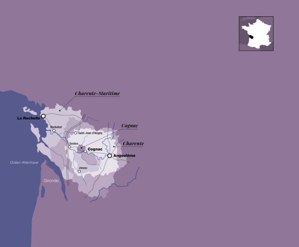 L’appellazione Cognac copre due interi dipartimenti della Francia, a nord il bacino del fiume Charente (nord di Bordeaux) ed alcune isolette del golfo di Biscaglia. Solo nel XVII secolo i vigneti della Charente furono destinati alla loro vocazione reale: produrre Cognac. Dapprima i marinari inglesi ed olandesi, che andavano a caricare i vini di Bordeaux, scoprirono che era gradevole riscaldare e bere il vino prodotto con l’Ugni Blanc durante le notti fredde. Poi gli scaltri mercanti irlandesi intuirono le potenzialità commerciali. Infine, la bravura dei distillatori della Charente diede giusta fama a questo inimitabile prodotto. Attenta distillazione, alambicchi in rame, affinamento in botti di rovere e tanta, tanta attesa: ecco il segreto per ottenere un grande Cognac. Grande Champagne, Petite Champagne, Borderies, Fin Bois, Bon Bois, Bois Ordinaire, questa la scala dei Cru.