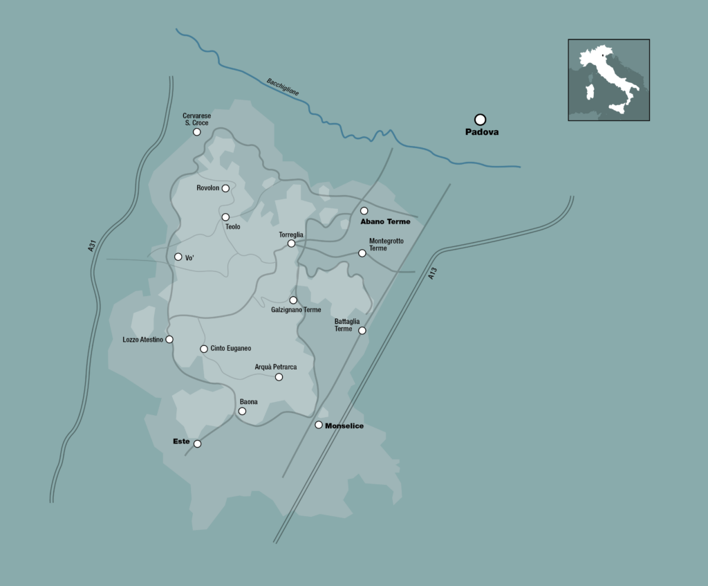 Addentrandosi verso il cuore degli Euganei, si scopre un mondo che ha preservato un fascino intatto. I rilievi si susseguono disordinati, in un intricato disegno dalle mille sfumature di verde. Pendii boscosi lasciano il posto a valli ampie e luminose, che si stringono poi in strette insenature. Rilievi irti e a volte scoscesi si sciolgono in morbide sinuosità ricamate dai filari dei vigneti, quasi a voler pettinare ordinatamente un territorio scontroso plasmando la terra con dolcezza.