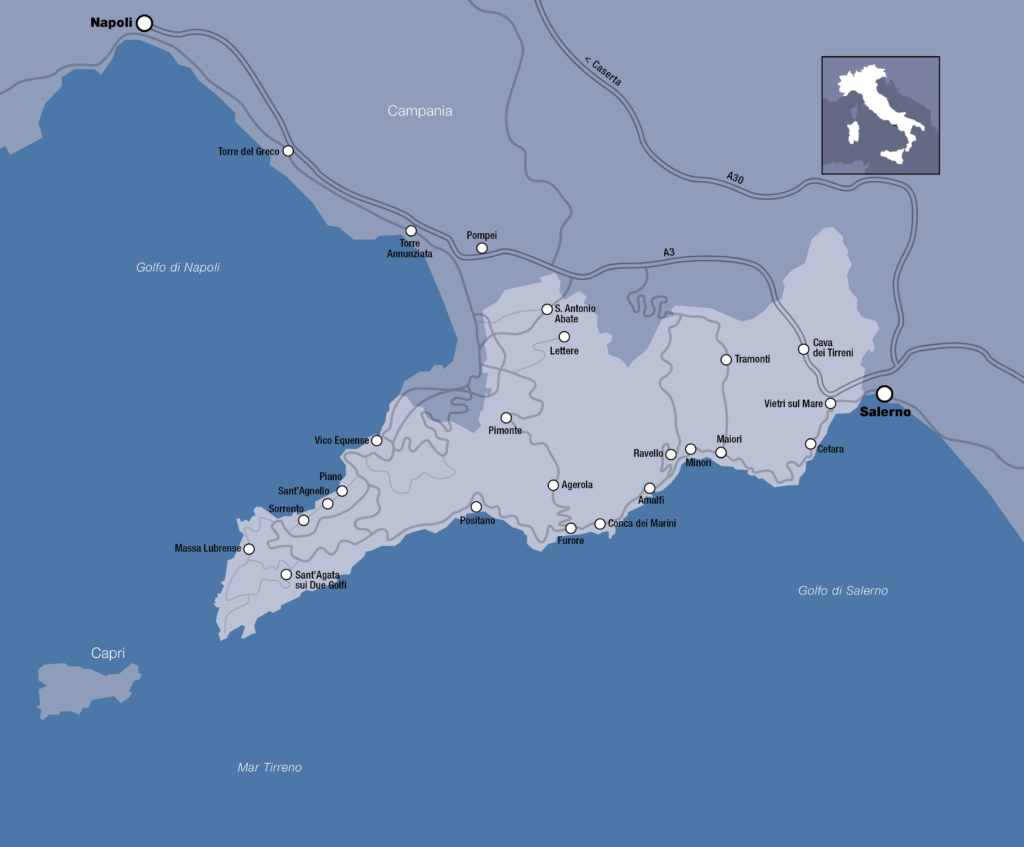 La configurazione della Costiera Amalfitana ha una sua indiscussa scenografia. Lambisce il mare con un andamento da merletto antico e svetta verso il cielo con le cime dei monti.