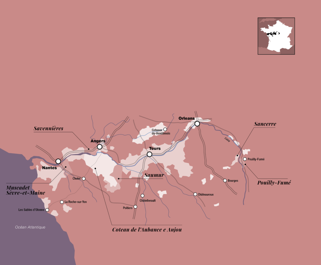 Vitigni come lo Chenin Blanc, il Muscadet, il Melon Blanc de Bourgogne, e più recentemente, Cabernet Franc e Sauvignon, a partire dal 1970 sono i principali attori che recitano la loro parte lungo le rive ed all’interno della Loira. Per unire poi, attraverso il Sauvignon, lo splendido villaggio di Sancerre e di Pouilly Fumé.