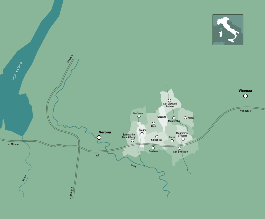 In particolare, il territorio, nel quale ricadono parzialmente o per intero i tredici comuni della denominazione, tocca cinque valli: la Valle di Marcellise, la Valle di Mezzane, la Valle d’Illasi, la Valle Tramigna e la Valle d’Alpone.