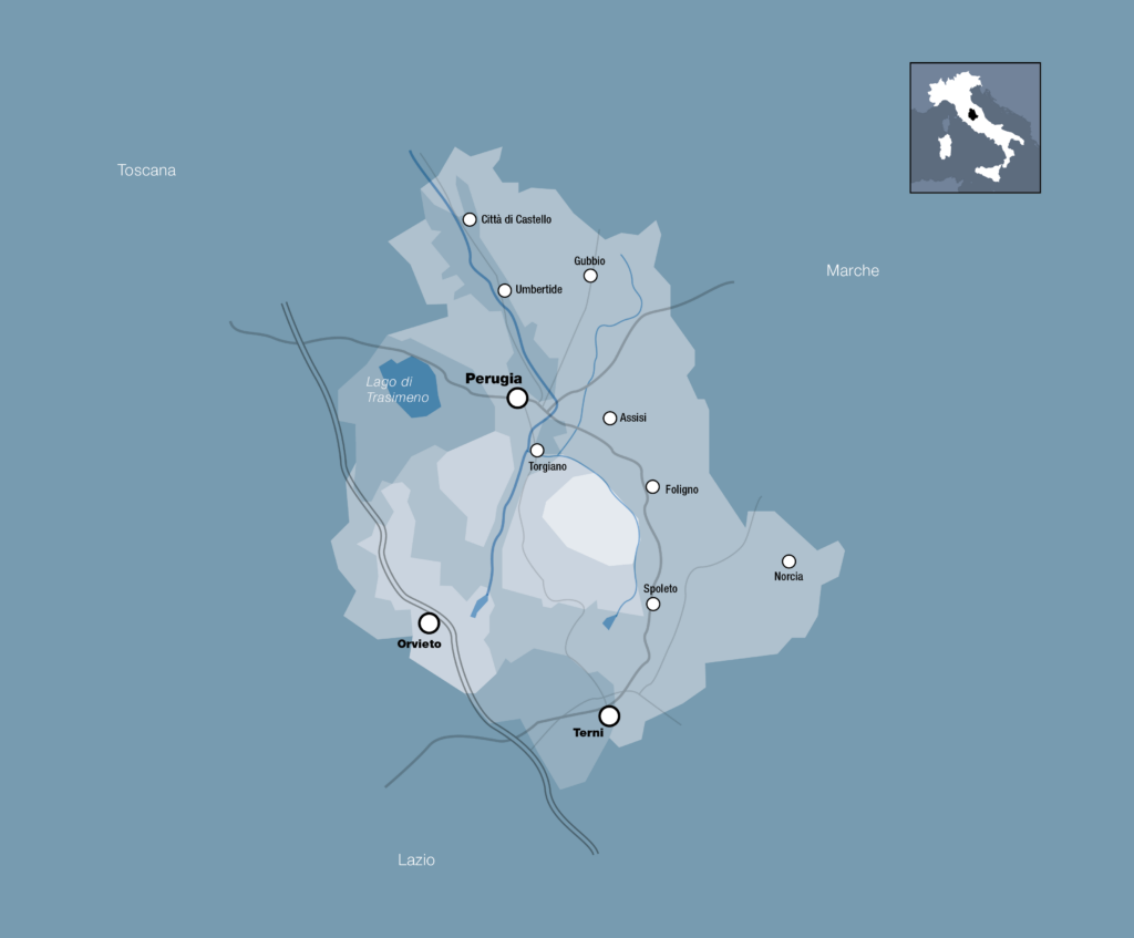 Gli ettari vitati sono circa 17 mila ed è l’unica regione d’Italia a non essere bagnata dal mare. Il susseguirsi delle colline è una caratteristica costante in tutta la regione, in un continuo salire e scendere di colli e pendii, di colori grigio-verde degli olivi e i vigneti intervallati da località ricche di arte, storia e tradizione.