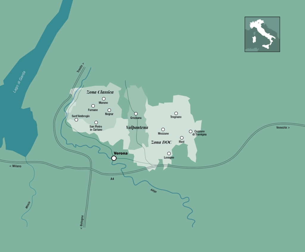 Più che una valle la Valpolicella è un blend di colline che danno le spalle a Verona, intervallate da paesini di origini antiche. A questo paesaggio, si aggiungono vigneti e cipressi che svettano qui e là. Il Lago di Garda si trova a 15 km più a ovest. Grazie alla sua vicinanza, il clima di cui si gode in questa parte della provincia veronese, è quasi mediterraneo.
